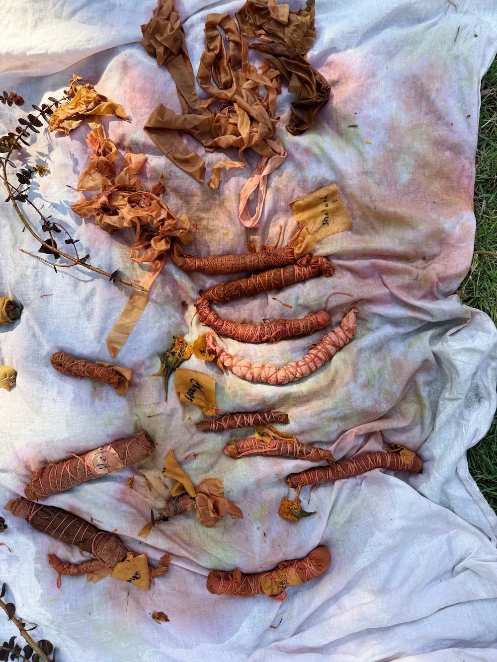 Leave in the sunshine for at least 4 days, but up to 10 days is good as well. It depends on the heat of the days, the fabric you’re dyeing, the plant materials (some give their colour quicker than others), and the results you’re wanting.