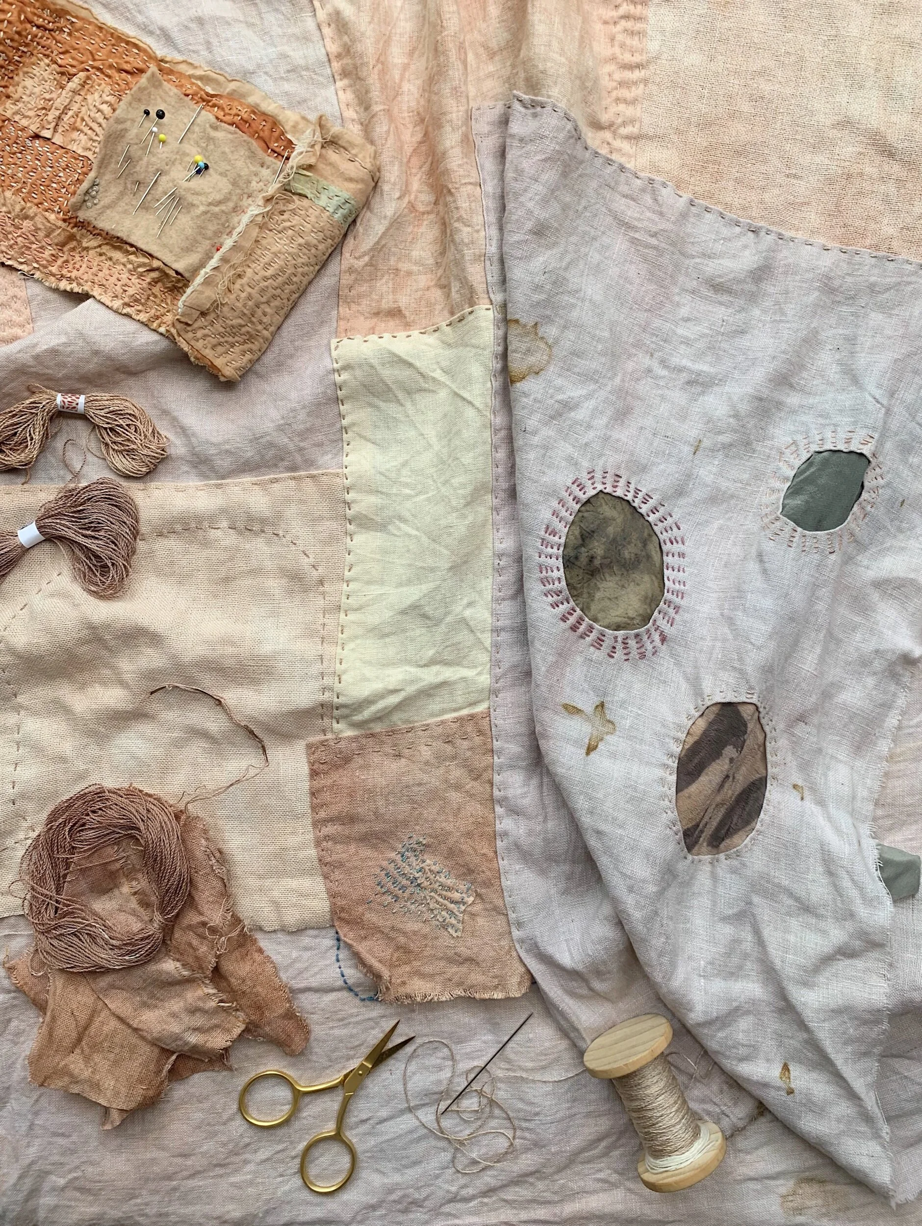 Part of slow stitching’s healing power lies in its sensory experience. The tactile nature of fabric and thread grounds us, and brings us to the here and now. Holding something steady in our hands, feeling the weave and weight brings us into ourselves. In a similar way to plunging our hands into garden soil, or picking up a pen and paper, rather than touching a screen or keyboard.
